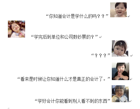 -我(心里):饭总是隔壁的香,局外人眼里的会计世界:工作悠闲、内容固定,每天都能准时下班回家享受生活,简直就是家庭生活与工作两头都舒坦的典范。