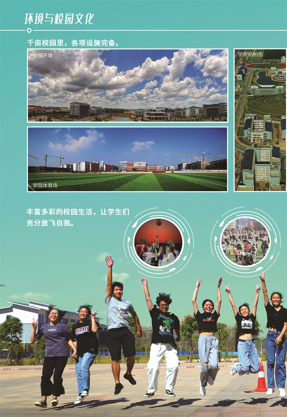 学院环境优雅,人文氛围浓郁,是读书求学的理想场所。学院占地面积1095.8亩,校舍建筑面积33.3万平方米,总投资10.81亿元,可容纳在校生10000余人。学院建有全塑胶田径运动场、足球场、篮球场等运动场所,4-6人/间的庭院式学生宿舍配备电梯、空调、热水和网络等生活设施。目前,学院购置了充分满足教学实习、实训需要的教学科研仪器设备及丰富多彩的图书资料,以现代信息技术为载体的智慧校园,为全校所有的实验实训室、网络多媒体教室,提供了广大师生喜爱的理论和实践一体化教学的先进教育教学环境条件。