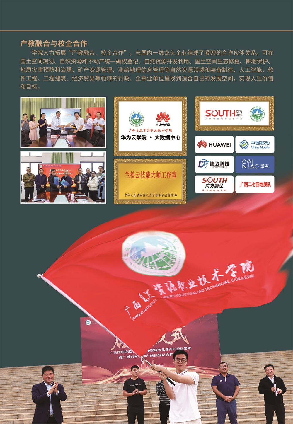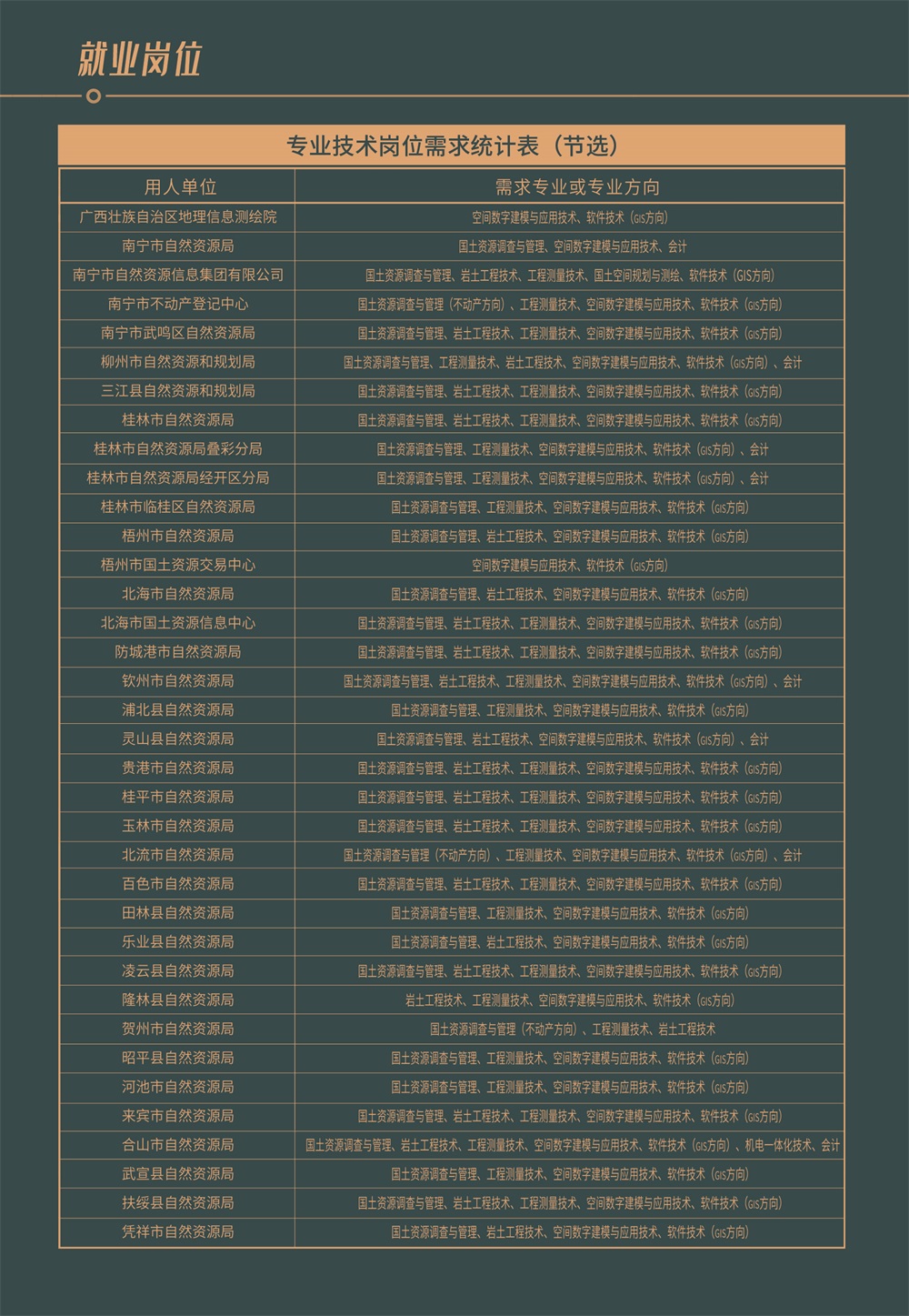 学院坚持开放办学,强化校企合作和产教深度融合,与区内外行政管理部门和知名企事业单位建立了人才输送的合作关系。学生毕业可在国土空间规划、自然资源和不动产统一确权登记、自然资源开发利用、国土空间生态修复、耕地保护、地质灾害预防和治理、矿产资源管理、测绘地理信息管理等自然资源领域和装备制造、人工智能、软件工程、工程建筑、经济贸易等领域的行政、企事业单位里找到适合自己的发展空间,实现人生价值和目标,更好的为广西自然资源行业和社会经济发展建功立业,成就出彩人生。