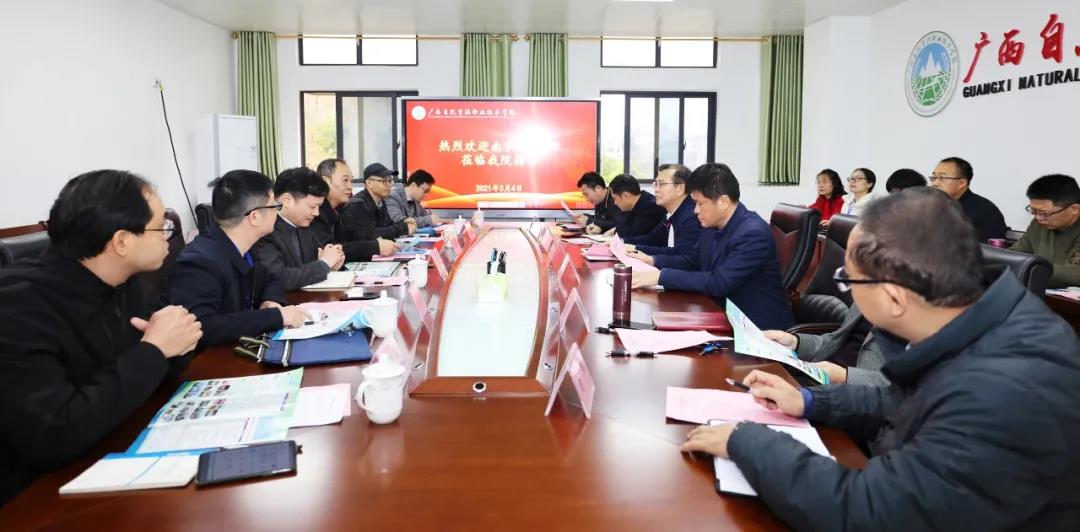 2021年3月4日下午,南宁师范大学地理科学与规划学院院长卢远、党委书记严志强、自然资源与测绘学院院长陆汝城、地理科学与规划学院李峙及张胜前、自然资源与测绘学院副院长段炼等一行,来到广西自然资源职业技术学院参观交流。