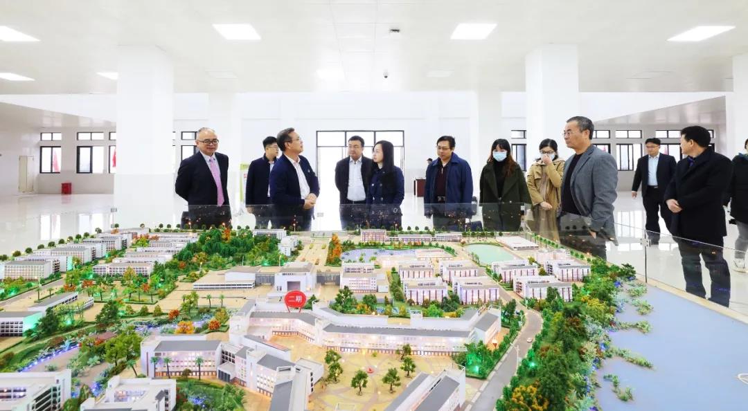 在学院沙盘模型前,陈朝新向客人全面讲述了学院“从无到有”的建设历程及相关经验,并介绍了覆盖整片校区的“鹰眼”影像监控系统的使用情况。双方就校区立项及建设时的资金筹措方案办法、校区前期建设推进时的资金筹措办法、筹建过程中主管厅局的协调及学校筹建小组的分工、校区建设的招投标及管理等领域的问题,进行了深入沟通与探讨。