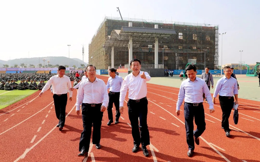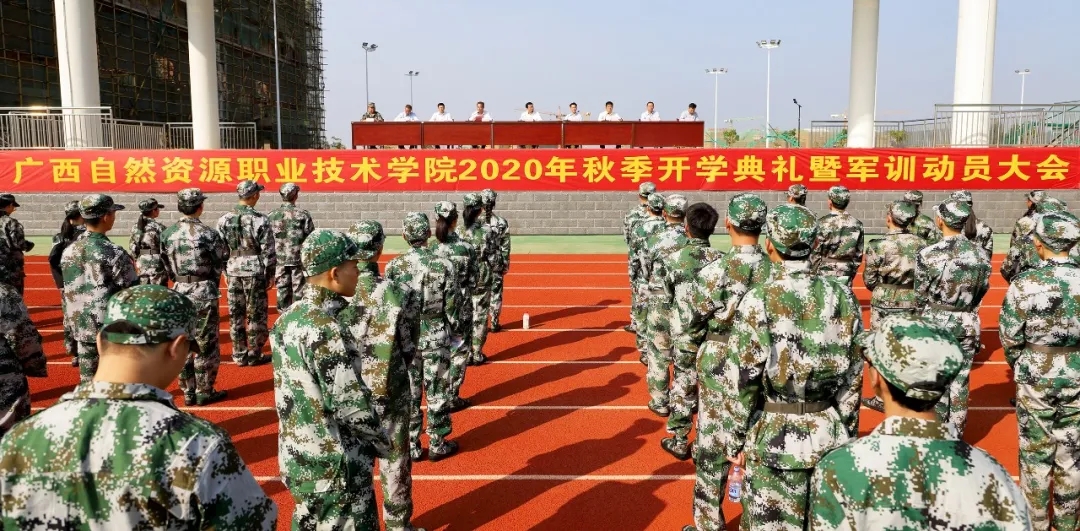 广西壮族自治区自然资源厅党组副书记、副厅长、一级巡视员谢瑾瑜,扶绥县委常委、县长黄建辉,自然资源厅人事处处长杨健,军训承训单位——广西陆战军训基地主任邵兵,学院党委书记陈朝新,学院院长冯兵,党委副书记兼纪委书记刘勇,副院长韦绍宁,副院长宇鹏等出席典礼,全体教职工及2000多名2020级新生参加了仪式。