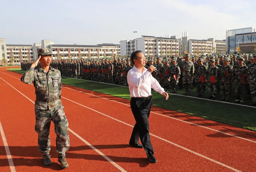 (学院党委书记陈朝新代表学院领导班子,亲切慰问参加军训新生)