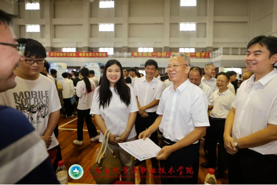 双选会上,贺志刚与用人单位和求职学生进行亲切交流,认真倾听学生的求职意向,勉励学生积极就业、持续提升岗位适应能力,并向用人单位推荐学生。
