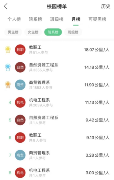 信息公开,你我争先。大数据管理平台设置了院系榜单和个人跑等数据榜单,随时更新跑步数据,创造一个良好的比拼氛围。
