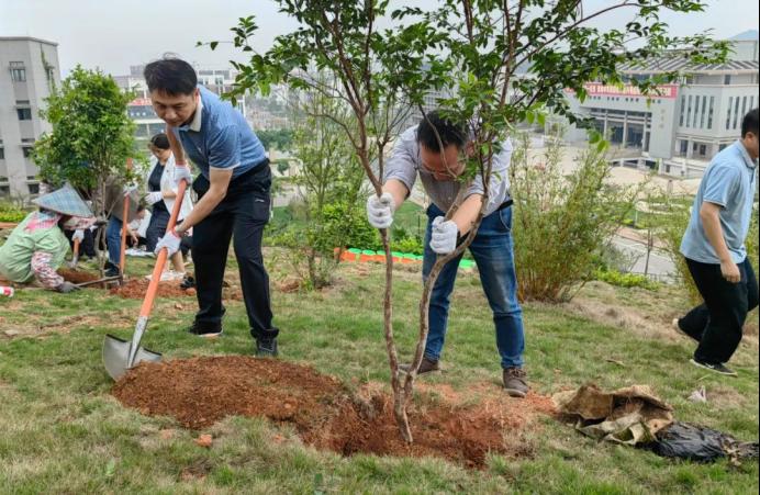 植树活动中,有人铲土,有人扶树,有人培土……大家3人一组,分工协作,合力种下一棵树苗,现场一派火热朝天的劳动景象,不一会儿,一棵棵挺立起来的芒果树、嘉宝树、琵琶树、柠檬树成了一片“绿树林”,为周边增添不少生机。