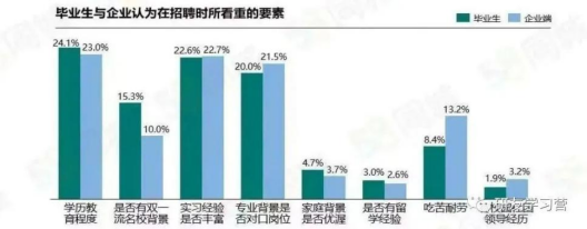 学历教育程度、实习经验、专业是否对口是招聘时所看重的前三大要素,已成为企业雇主及毕业生的共识;此外,毕业生相比企业雇主更加看重双一流名校背景,而企业雇主相比毕业生又更加看重吃苦耐劳的品质,以及校园社团运营所展现出的领导力。