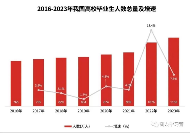 近年来,我国高校毕业生人数连年攀升,2022年高校毕业生规模达1076万人,较2020年增加18.4%。而2024年,这一数字是1187万。
