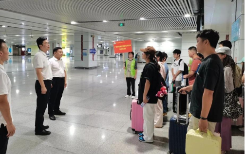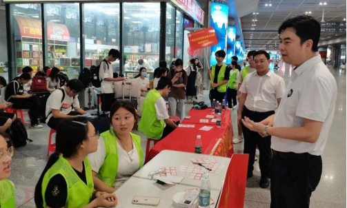 (学院党委书记成国立,学院党委委员、纪委书记莫文希在南宁火车东站慰问接新生志愿者)
