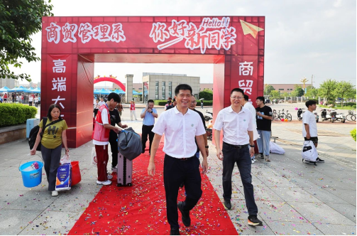 (院长冯兵代表学院党委迎接第一位前来报到的单招新生)