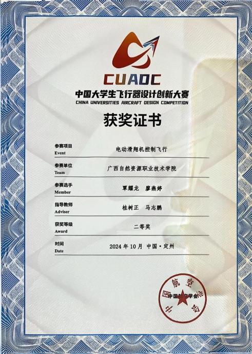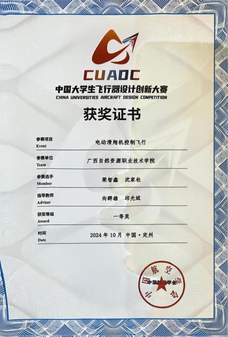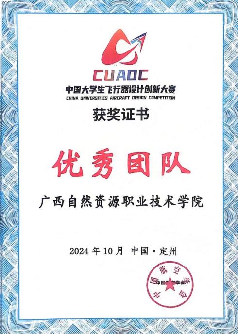 金秋十月,喜讯传来:广西自然资源职业技术学院机电工程系组建的代表队,在由中国航空学会主办的“2024中国大学生飞行器设计创新大赛”总决赛中,取得佳绩,喜获国家级一等奖荣誉两项、二等奖荣誉两项。
