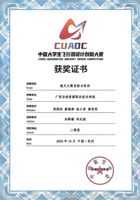 大赛以“凌云创智、空天争锋”为主题,自2024年5月启动以来,吸引了来自全国近120所高校的踊跃参赛。广西自然资源职业技术学院参赛队伍的多个参赛机组在中国南部地区选拔赛中表现出色,获得参加总决赛的资格。