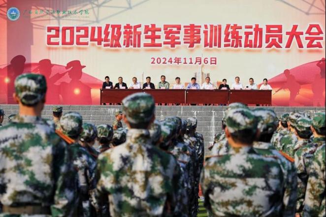 金秋11月,广西自然资源职业技术学院2024年新生军事训练动员会在校区盛大举行。学院党委书记成国立,党委副书记、院长冯兵等出席动员会,学院军事训练领导小组成员相关负责同志,崇左军分区战备建设处参谋刘双振,2024级辅导员、承训教官及4200余名2024级新生参加动员会。动员会由学院党委副书记、副院长刘勇主持。