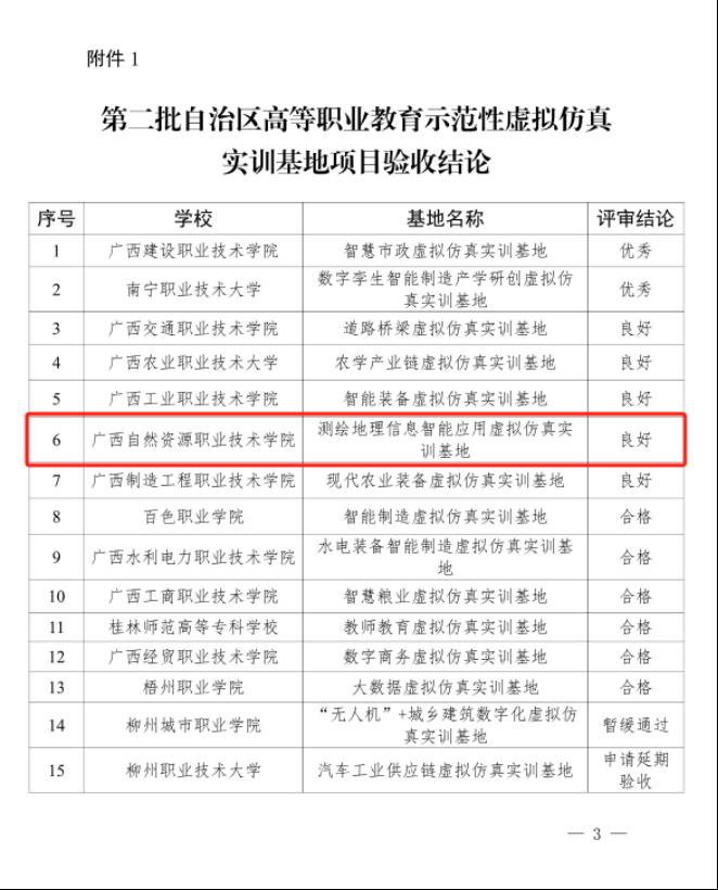 2024年11月中旬,喜讯传来:自治区教育厅公布了第二批自治区职业教育示范性虚拟仿真实训基地项目验收结论的通知,广西自然资源职业技术学院测绘地理信息智能应用虚拟仿真实训基地(以下简称“实训基地”)以良好的成绩顺利通过了验收!据悉,该虚拟仿真实训基地项目是学院第一个通过教育厅验收的项目。