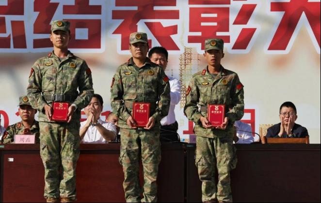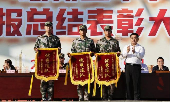 成国立、冯兵、刘勇、莫文希分别为军事训练优秀标兵代表、优秀教官代表、优秀宿舍代表、优秀连队代表颁奖。