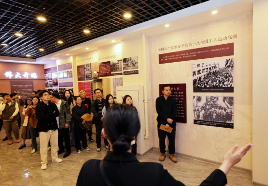 活动开始之际,教职工们踏入体验馆一楼的展览大厅。此处以1919年至1949年间中共党史和中国工运史的重要历史交汇事件为脉络,分为“伟大开端”“山重水复”“抗日烽火”“天翻地覆”四大篇章。