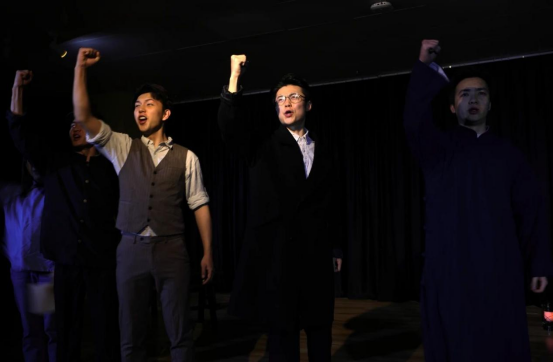 体验活动中,参加活动的全体教职工庄重站立,与台上演员一同慷慨激昂地唱响国歌《义勇军进行曲》,歌声久久剧场内回荡……