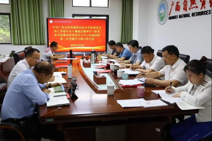 2025年4月24日下午,广西自然资源职业技术学院党委召开深入贯彻中央八项规定精神学习教育读书班暨党委理论学习中心组2025年第1次专题学习集中研讨会,深入学习领会习近平总书记关于加强党的作风建设的重要论述和关于广西工作论述的重要要求,并学习贯彻中央八项规定及其实施细则精神。学院党委书记成国立主持会议并讲话。
