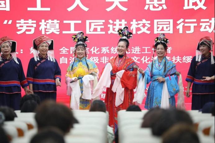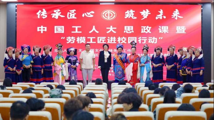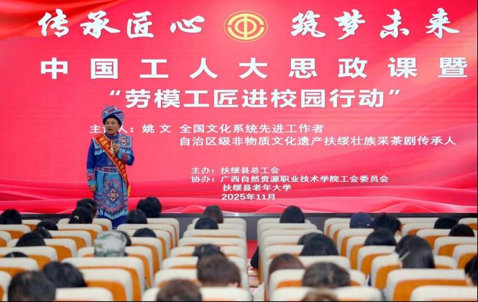 为贯彻落实习近平总书记关于工人阶级和工会工作的重要论述,发挥劳模工匠榜样作用,广西自然资源职业技术学院联合扶绥县总工会于2025年11月13日开展了“劳模工匠进校园”主题活动,此次活动邀请了自治区级非遗传承人姚文老师进到校区,与大学生们开展交流。