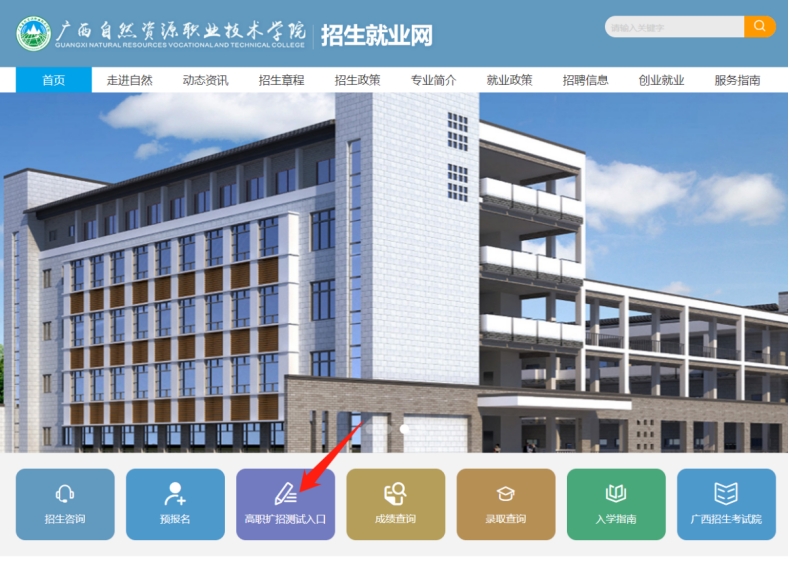 第一步:学院官网首页点击“招生就业”进入招生就业网点击“高职扩招测试入口”(https://zsjy.gxnrvtc.edu.cn/index.htm)