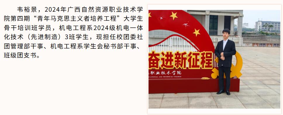 青春奋斗,砥砺自我,梦想起航。大家好,我是2024年广西自然资源职业技术学院第四期“青年马克思主义者培养工程”大学生骨干培训班学员韦裕景。作为青马学员,我们应当将奋斗精神融入到日常学习和生活中,以拼搏进取的姿态追逐青春梦想。