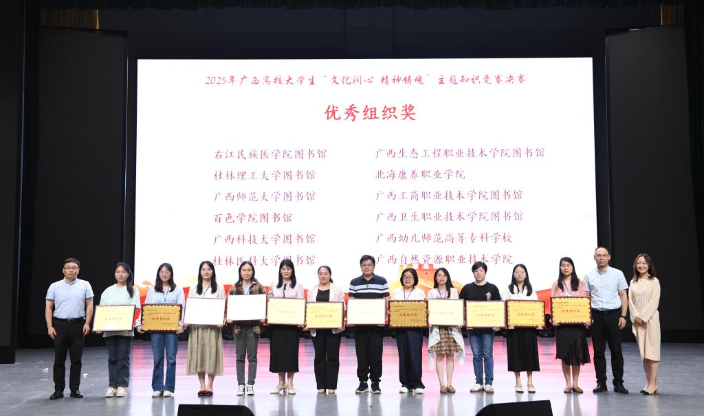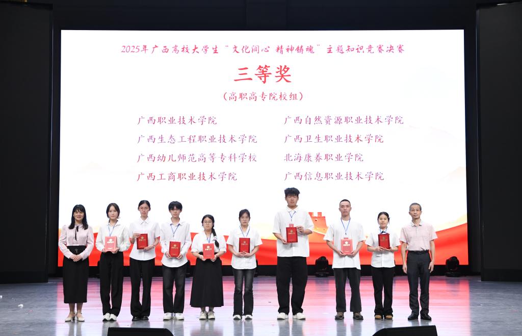 5月24日,2025年广西高校大学生“文化润心 精神铸魂”主题知识竞赛决赛在桂林医科大学顺利举行。我校商贸管理系2022级电子商务6班杨诗诗、机电工程系2023级机电一体化1班李佳政、自然工程系2024级工程测量技术2班梁琼芳三名同学凭借扎实的知识储备与出色的现场表现,荣获高职高专院校组三等奖;我校图书馆荣获优秀组织奖。