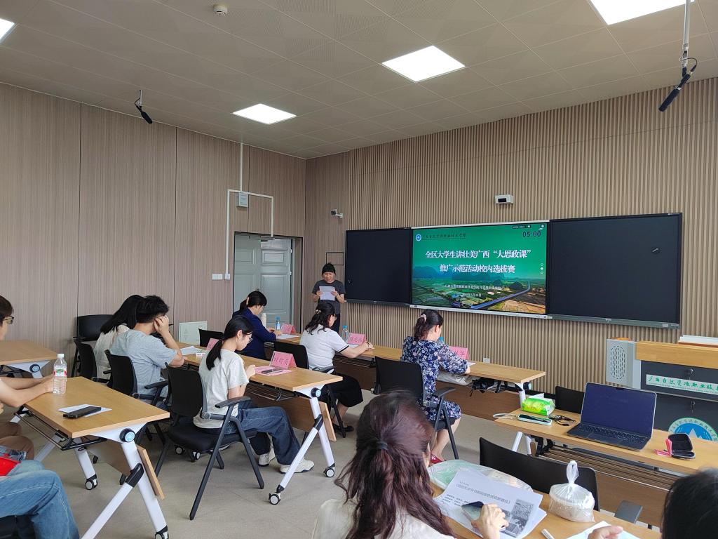 为深入学习贯彻习近平总书记关于“大思政课”建设的重要指示批示精神,推动思政教育“小课堂”与社会“大课堂”相结合,深化“00 后话百年”宣传教育品牌,充分展现我区“00 后”大学生良好的政治素养、理论水平、精神风貌和浓厚的家国情怀,5月15日下午,我校在智慧教室406开展大学生讲壮美广西“大思政课”推选展示校内初选活动。