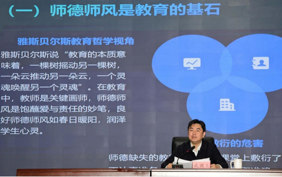 随后,成国立以“立德树人铸师魂不忘初心正师风”为主题,结合典型案例,为全校教职工上一堂生动的师德师风暨党风廉政专题课。
